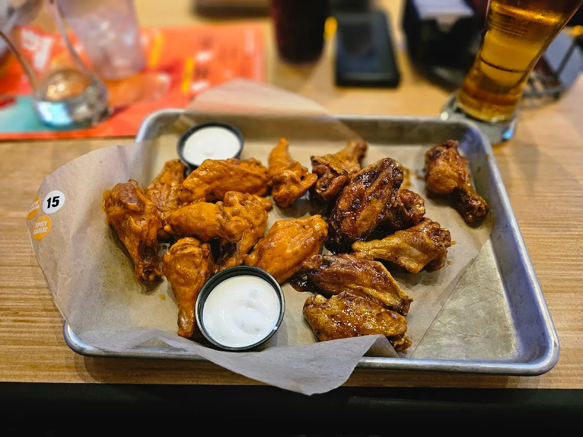 Chain dishing up wings, tenders & burgers, plus sauces ranging from sweet to very spicy.