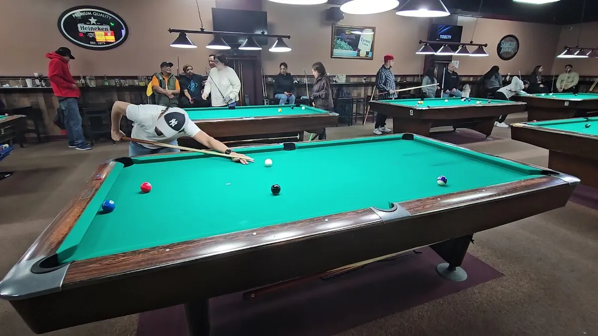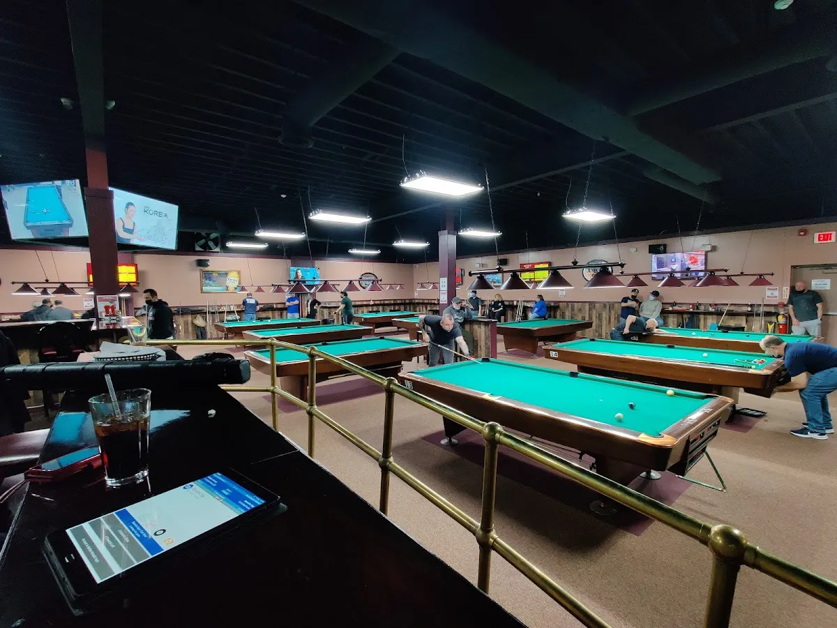 14 pool tables for regular & tournament play in a family-friendly spot with jukebox & full kitchen.