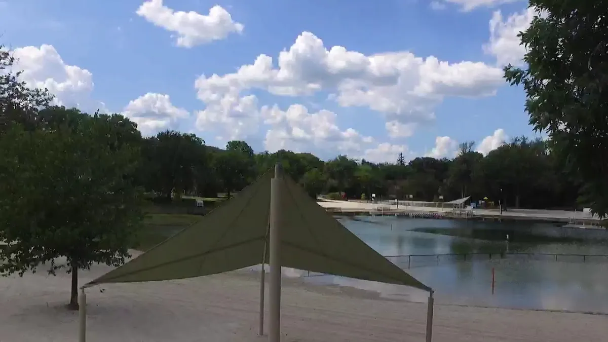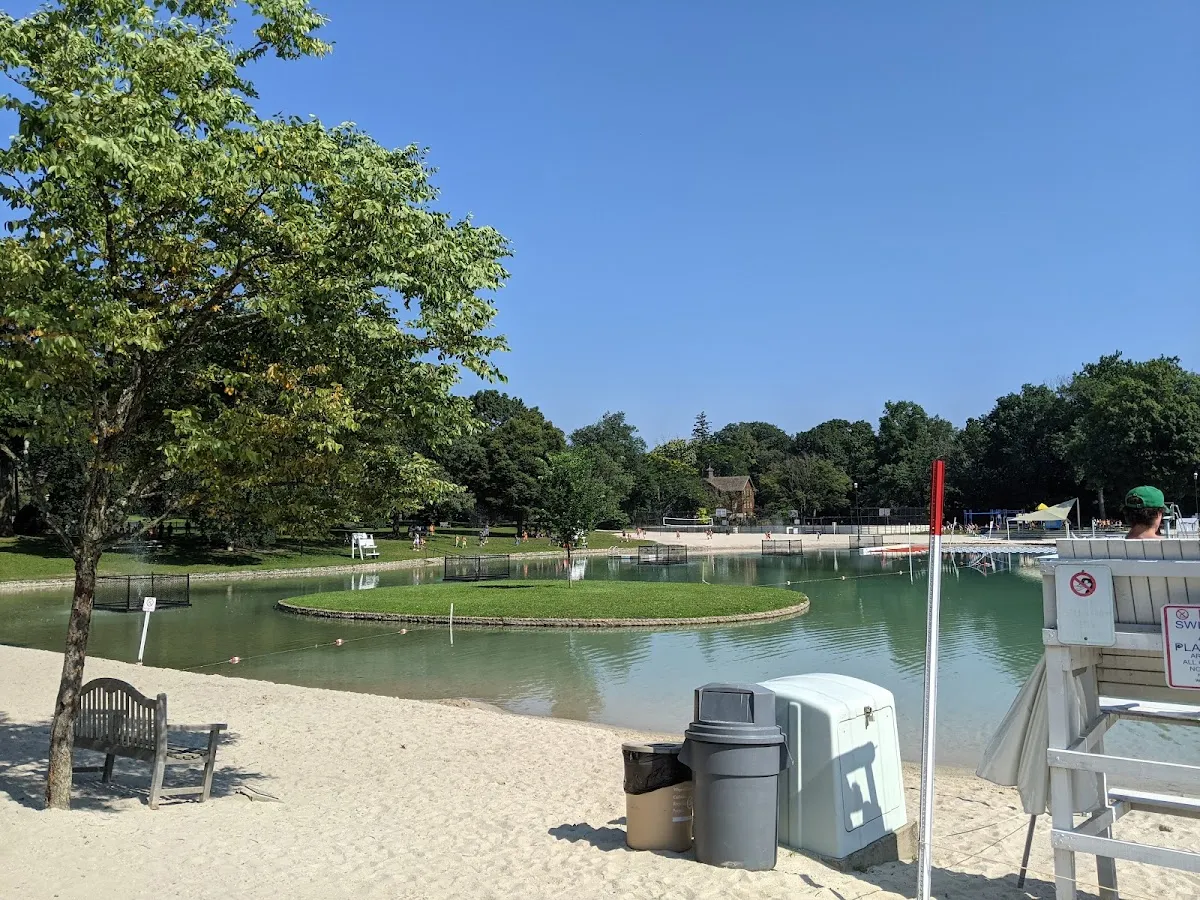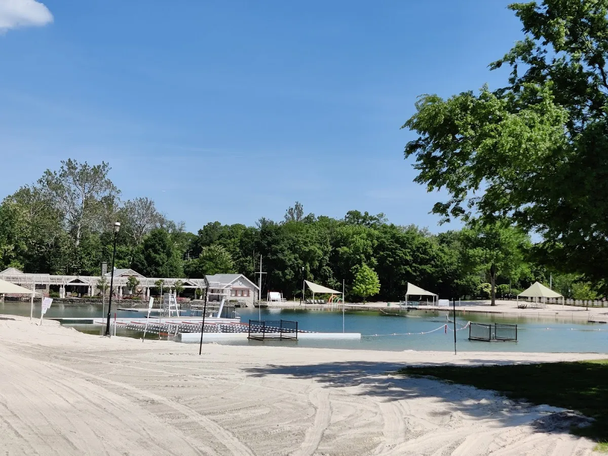 Featuring a sandy beach for sunning, this pool also offers picnic & play areas, plus sports courts.