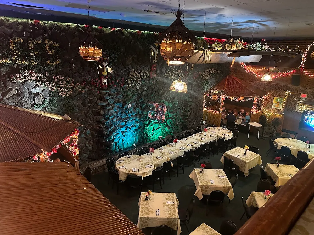 Festive tiki bar featuring tropical cocktails, pupu platters & weekend karaoke amid kitschy decor.
