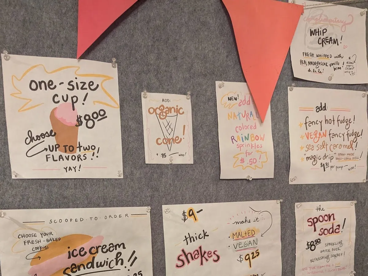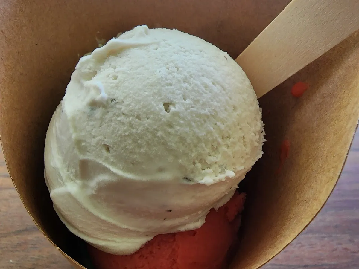 Inventive ice cream made from organic ingredients along with baked sweets in a compact setting.
