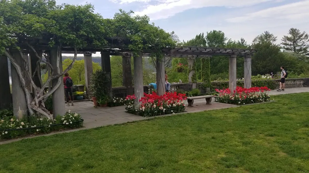 Expansive, manicured public garden with wooded paths, benches & Hudson River views.